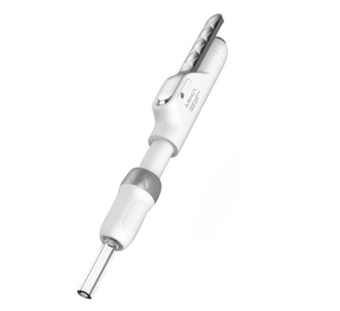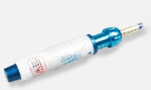 El sistema de inyección suave sin aguja administra soluciones líquidas a través de una línea recta de fluido de velocidad muy estrecha (esencialmente, una "aguja de fluido") que se establece por acción de un resorte de alta presión y que, por un pequeño orificio en la cara de la boquilla, penetra en la piel y administra la solución en el organismo.